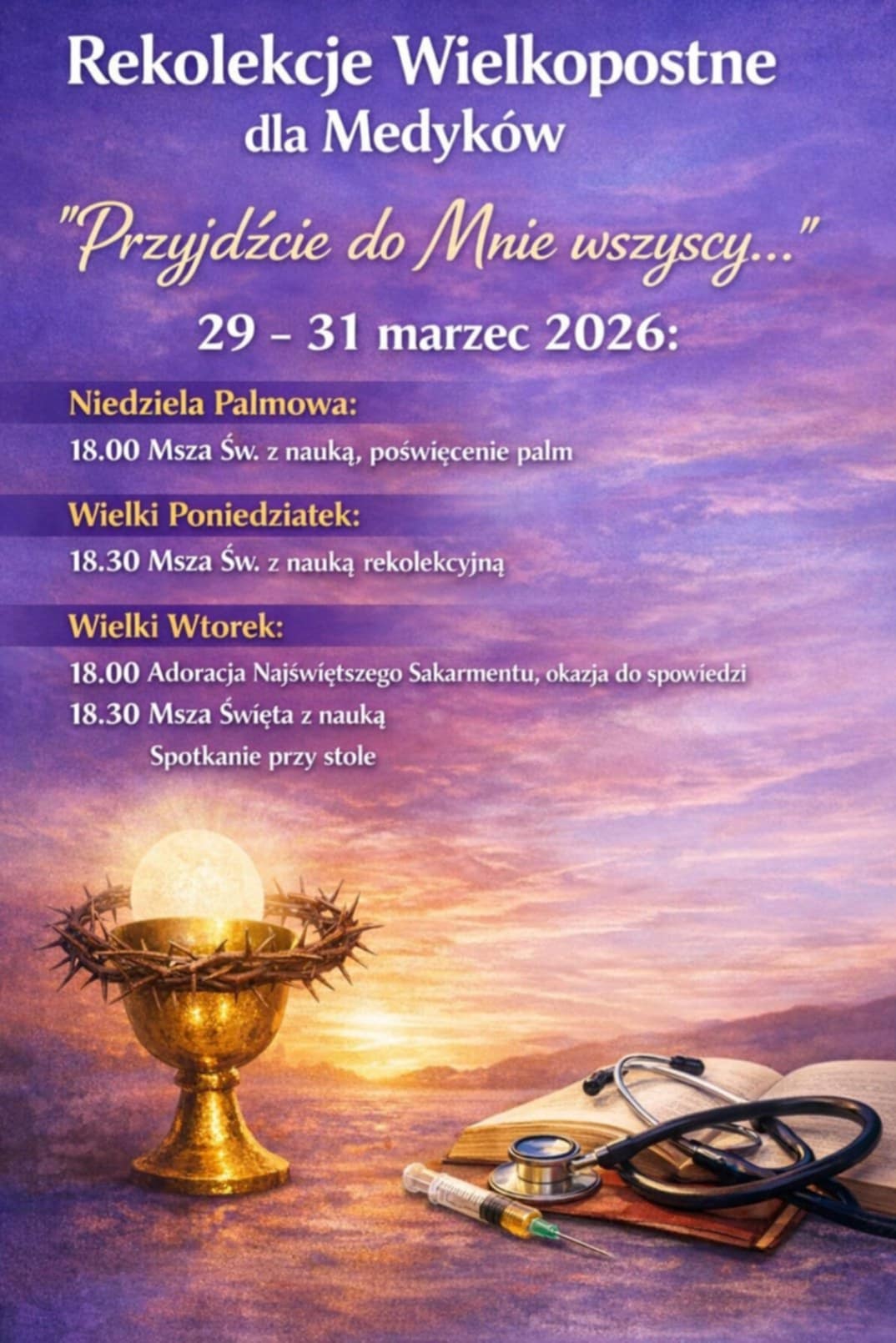 Rekolekcje wielkopostne dla medyków 20 lutego 2026 Rekolekcje odbędą się w kaplicy kurii diecezji bielsko-żywieckiej w Bielsku-Białej przy ul. Żeromskiego 5a. ZAPRASZAMY!