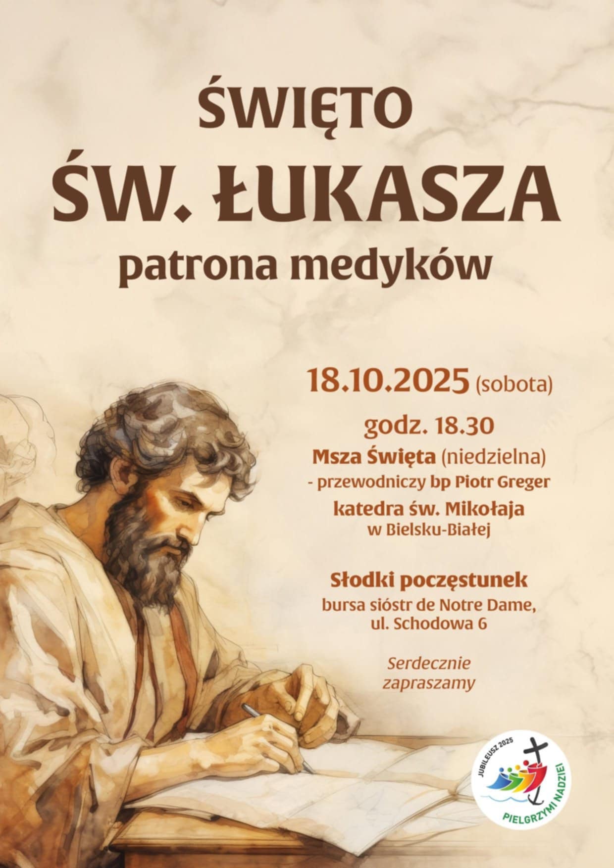Wszystkich pracowników służby zdrowia bardzo serdecznie zapraszamy dnia 18 października do udziału w święcie naszego patrona- Św. Łukasza. Rozpoczniemy w katedrze Mszą Świętą o godzinie 18:30 pod przewodnictwem ks. Bpa Piotra Gregera,